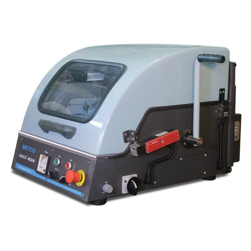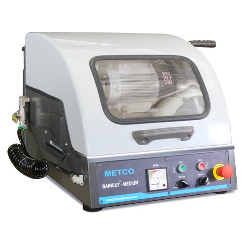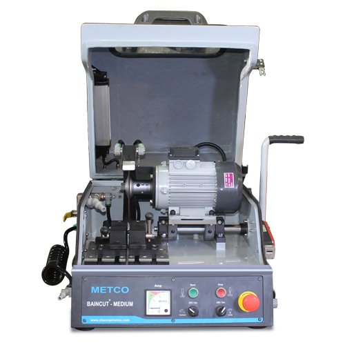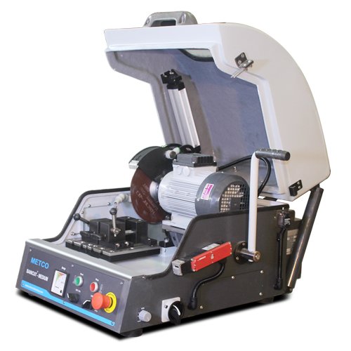 Robusto modelo de cortador de sobremesa para el seccionamiento metalográfico de muestras de metales, cerámicas y minerales. ventana de visualización, iluminación interna, sistema de refrigeración de recirculación, chorro de lavado, interruptor de límite de seguridad. Corte bajando la rueda con el mango (movimiento Z).